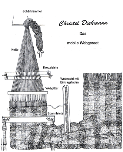 1977 entwickelte Christel Diekmann aus der europäischen Bandwebe das mobile Webgerät für die heutige Zeit. Der Webvorgang ist dem am Webstuhl gleich, das heißt ein rhythmisch-dynamischer mit ständigem Handwechsel. Dadurch gehen Fachwechsel, Eintragfadeneinführung und Anschlag schnell von der Hand. Die schmale Breite erlaubt das Abweben direkt vom Kettzopf und das Einklemmen des Gewebes in eine Spannleiste. Die Kette befindet sich zwischen der am Körper oder Stuhl mit Gurten befestigten Spannleiste und einem Festpunkt. Das Webgitter ist zuständig für Fachbildung, Kettdichte und Anschlag des Eintragfadens. Die zahlreichen Kettdichten ermöglichen feine bis grobe und lockere bis feste Gewebe für Kleidung, Heimtextilien und Kunstobjekte. |